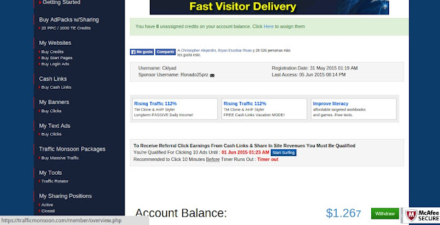 TrafficMonsoon es una PTC que se dedica a llevar trafico o visitas a páginas en la cual te pagan por ver los anuncios y se puede generar 1$ en sólo 4 días sin tener referidos con anuncios de hasta 0,02$ que es considerablemente una tasa alta para los pagos por click, diariamente se puede generar entre 0,20$ o más. Los anuncios son activados a una hora exacta cada 12 horas (Hora de Venezuela 7:30 am/pm). Tiene un pago mínimo de 2.00$.